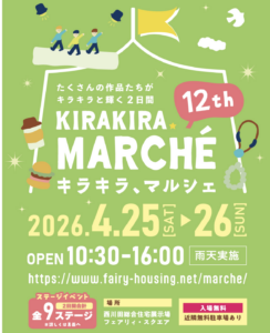 今週末の4月26日(日)、西川田総合住宅展示場 フェアリィ・スクエアさんで開催される「キラキラマルシェ」のステージに出演させていただきます♪